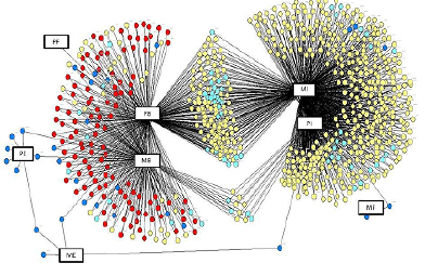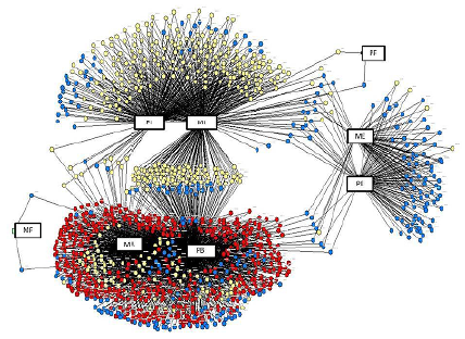 A similaridade dos dados apurados para as duas localidades insinua a existência de um padrão de escolha para padrinho e madrinha. Tanto na Figura 2 quanto na 3 se pode notar que em todos os grupos as escolhas dos padrinhos promoveram a formação de aglomerados em torno dos núcleos PB, MB, PI, MI, PE e ME. Apenas um estrato menor entre os indígenas mesclou o compadrio escolhendo uma madrinha guarani e um padrinho branco, o que é perceptível no emaranhado formado entre os núcleos MI e PB nos dois diagramas.