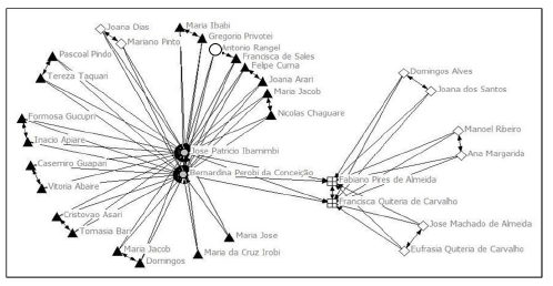A Figura 6 evidencia as relações estabelecidas por um casal guarani que notabilizou-se por ter sido bastante requisitado para apadrinhar crianças, sobretudo entre os guarani. José Patrício Ibamimbi e Bernardina Perobi da Conceição eram guarani naturais do Povo de São Borja. Em torno deles reuniram-se 22 sujeitos, dos quais 19 eram guarani (indicados na figura com triângulos), sendo que 16 destes formavam oito casais. Por outro lado, quando o dito casal teve um filho, preferiu estabelecer laços de compadrio com um casal de luso-brasileiros. Com base nisso, podemos ensaiar alguns argumentos sobre estes enredos sociais.