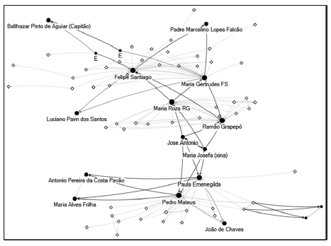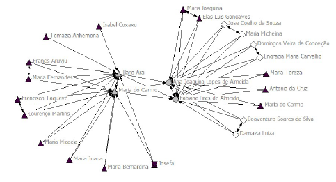 Em Santa Maria também é possível identificar entre alguns guarani comportamentos assemelhados aos de José Patrício Ibamimbi e Ilário Arai. Ao longo de três décadas (1814 a 1845), os casais Felipe Santiago - Maria Gertrudes e Pedro Mateus - Paula Hermenegilda teceram teias relacionais em que estabeleciam laços com atores sociais proeminentes da sociedade luso-brasileira. Na Figura 8 apresentamos uma representação gráfica de tais redes.