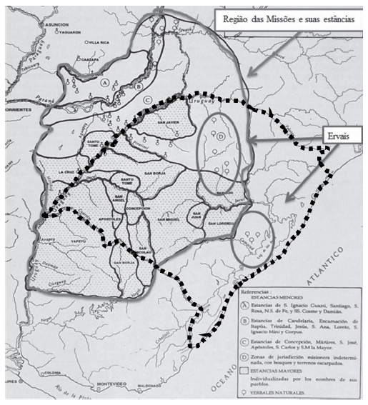 = limites da região das Missões com suas estâncias e ervais