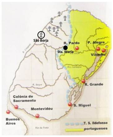 Considerando o território atual do Estado brasileiro do Rio Grande do Sul (doravante, RS), até por volta dos anos 1770, praticamente dois terços dele integravam o Império Espanhol e era ocupado por sete missões de guarani (doravante, Sete Povos), estâncias de criação de gado e ervais. Aquele espaço (localizado do lado oriental do rio Uruguai) era cobiçado pelo Império lusitano que, desde o século XVII, vinha se expandindo a partir do leste, fundando povoações e pressionando os guarani-missioneiros e outros povos indígenas. De modo a fixar fronteira entre os dois impérios, em 1777 foi firmado entre as duas Coroas o Tratado de Santo Ildefonso, o qual estabeleceu uma linha imaginária que, grosso modo, cruzava pelo centro do território (atual do RS) no sentido norte-sul. Durante a demarcação dos limites do tratado, em 1797, os portugueses fundaram Santa Maria da Boca do Monte (doravante, Santa Maria) na extremidade mais ocidental de suas possessões, a chamada fronteira do Rio Pardo (ver mapas na seção anexos).