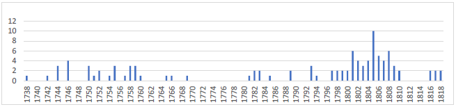 Con respecto a los años anteriores a la Independencia, el promedio de causas por hurtos conservadas en el AGN para los 80 años, que van de 1738 a 1818, es de 1.275 por año, lo que parece poco teniendo en cuenta lo frecuentes que eran estos delitos según las percepciones oficiales. El periodo de mayor frecuencia de causas en promedio es el que va de 1800 a 1810, en el que se observa una mayor actividad judicial de la Real Audiencia, en primera instancia, con apoyo de las comisiones a los alcaldes de Barrio para los sumarios35. Esto pudo ser expresión de los temores de las autoridades reales en Santa Fe con respecto a la población de origen americano, en un periodo en el que la autoridad española en el virreinato venía debilitándose36.