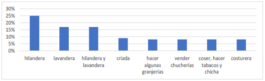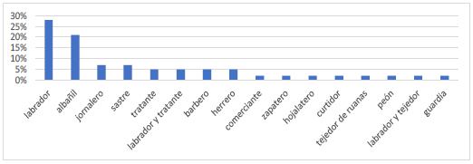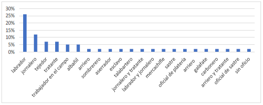Los oficios de los reos, como se indicó previamente, correspondían a los de la población mestiza y blanca pobre de la región, que, para el periodo Colonial, eran principalmente los que tenían que ver con labores agrícolas. En segundo lugar, estaban diversos oficios urbanos, entre los que se destacaban los de índole artesanal o comercial. En cuanto a las mujeres, se observa un predominio de oficios urbanos, puesto que, de hecho, todos los juicios contra mujeres fueron por delitos cometidos en la ciudad y sus términos.