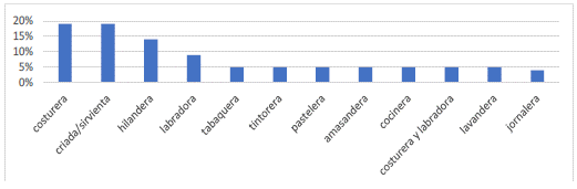 Un cambio que se observa para los años de 1819 en adelante es el aumento de los oficios urbanos entre los hombres, lo que sin duda estaba relacionado con el incremento de la proporción de los delitos en la capital, con respecto a los campos y pueblos vecinos. En cuanto a las mujeres, de nuevo hay un predominio de los oficios urbanos.
