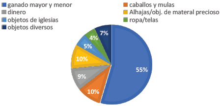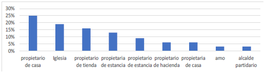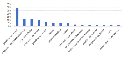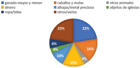 Entre los afectados por los hurtos no estaban solo la iglesia y los grupos que ocupaban la posición social superior, conformados por los blancos 'españoles' y sus descendientes. Además de los propietarios de inmuebles urbanos y de los hacendados que resultaban perjudicados por los hurtos, aproximadamente un 21% de los ofendidos, que acudían a la justicia ordinaria y que aparecen en los juicios, correspondía a propietarios de potreros o 'estancias' rurales. Estos debían de formar parte del sector de los 'orejones', que había surgido socialmente en el siglo XVIII y estaba compuesto por «vecinos vinculados con las labores agropecuarias y posiblemente con el comercio local, que habían logrado acumular medianas fortunas»45. Si se incluyen, además, a los propietarios de tiendas y pulperías (16%), los porcentajes y la información de los casos indican, pues, que había una gran proporción de sectores sociales medios entre los afectados por los hurtos. Así, no eran solo los grupos superiores en la escala social de la ciudad los que acudían a la justicia ordinaria para defender sus bienes, sino que los grupos 'medios' también llegaban a usar esos mecanismos.