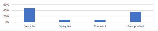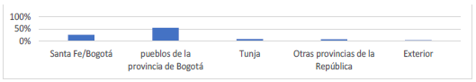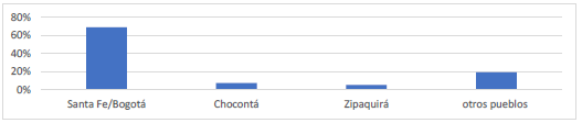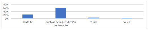 En cuanto a los lugares de inicio de los juicios, como muestra el gráfico siguiente, casi la mitad de ellos corresponden a la capital, lo que sin duda se debe, en gran medida, a la concentración de los jueces ordinarios en la ciudad. A pesar de la presencia de alcaldes pedáneos en los pueblos desde 1759, esto tampoco garantizaba un aumento considerable de los juicios criminales en sus zonas de actuación, puesto que difícilmente podían estar en comunicación permanente con la Real Audiencia o con los alcaldes ordinarios, y solo ocasionalmente los sumarios que formaban terminaban en Santa Fe. También hay que considerar que la capital era, de lejos, la población con más habitantes de la región y la más propicia para una circulación rápida de objetos hurtados.