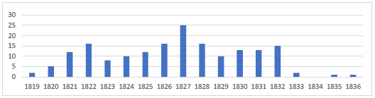 El promedio de casos es de 10,4 por año, aproximadamente, lo que significa que, en comparación con los ochenta años anteriores, las causas criminales por año se multiplicaron aproximadamente por diez, reflejando un aumento considerable de los hurtos hasta 1832. A partir de 1833, los juicios conservados en el AGN disminuyen considerablemente, factor que, en principio, indica una menor cantidad de denuncias por hurtos en la República de la Nueva Granada luego de la situación más conflictiva de la República de Colombia.