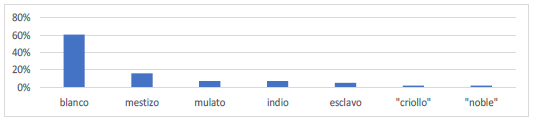 Con respecto a la 'calidad' de los reos, no aparecen variaciones sustanciales, como se observará en los dos gráficos siguientes. Los números no deben tomarse como una información exacta, sino solo aproximada por las razones previamente indicadas. En ambos periodos se observa un predominio de reos autoidentificados como 'blancos', seguidos de los mestizos en la Colonia y de indios en los años republicanos. Esta información encaja con la que se verá más adelante sobre los oficios a que se dedicaban los reos, que tendían a ser aquellos ejercidos por la población mestiza y blanca pobre de la ciudad, y sus pueblos y campos circundantes. Esto indica que, en Santa Fe, entre los reos no solo había sujetos que ocupaban la posición más baja en la escala social, es decir, los indios, los mulatos, los negros, los zambos y demás castas44. Los delincuentes provenían, ante todo, del sector de 'blancos' y mestizos pobres que se incrementaban en la región desde el siglo XVIII.