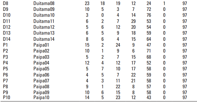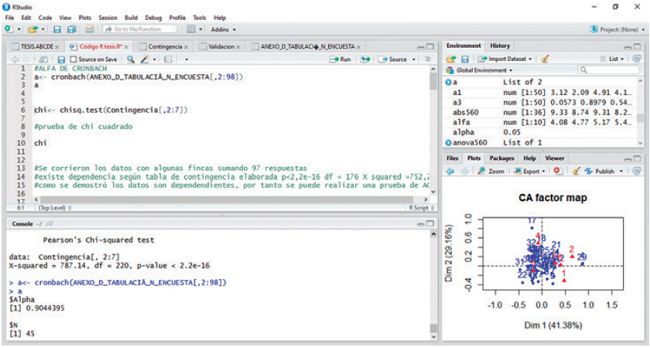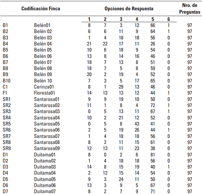 Para el análisis estadístico se le asignó un código en R a cada finca y se construyó la “Tabla de Contingencia” para la encuesta “Caracterización del clima organizacional de las empresas tecnificadas de ganadería de leche de la provincia del Tundama en el departamento de Boyacá (Colombia)”. Una tabla de contingencia cruza información de variables cualitativas, con las cuales se recogen características que poseen los individuos, con el fin de hallar asociaciones y pesos a través de las categorías, establecer la relación entre variables de naturaleza categórica y medir la frecuencia de cada una de las opciones de respuesta para las 97 preguntas del instrumento en cada una de las fincas.