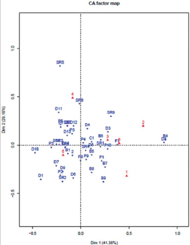 Por otra parte, la dimensión del análisis que corresponde a los ejes de la representación gráfica (Figura 2), es una combinación de las variables originales y su asociación mediante un peso definido; tener un mayor peso entre la variable original y la dimensión implica un mayor grado de asociación. Se evidencia que las dos primeras dimensiones, Dimensión 1 (43.32%) y Dimensión 2 (30.58%), representan un 73,9% de la variación de las variables originales.