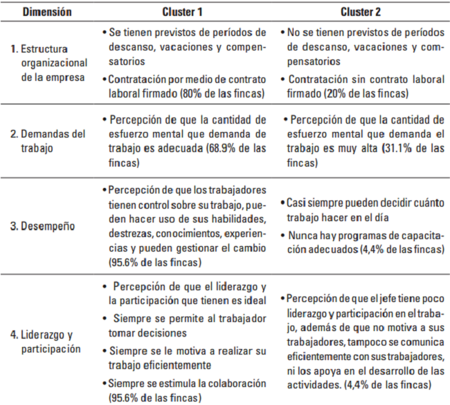 Con los datos obtenidos se formaron dos clústers, uno de ellos para agrupar las fincas que tienen el comportamiento más cercano al ideal en cada dimensión y el otro, a aquellas que tienen el comportamiento más lejano de dicho ideal. Los resultados de este proceso permitieron establecer las características de las fincas pertenecientes a cada uno de los dos clúster (Tabla 4).