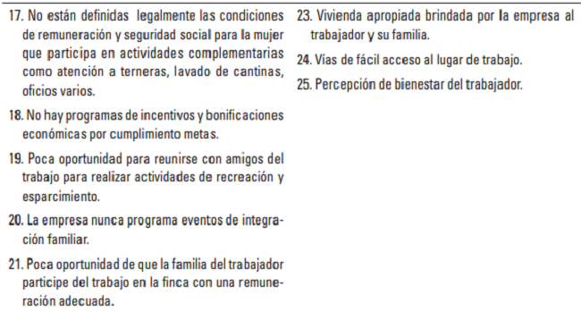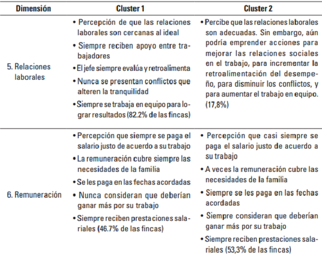 Con relación a la dimensión 6, “Remuneración”, en el 15,55% de las fincas se registró la tendencia a bajas valoraciones, evidenciando problemas relacionados con la percepción negativa que tienen los trabajadores respecto a su salario y prestaciones sociales, sobre todo en la consideración que deberían ganar más dinero por su trabajo.