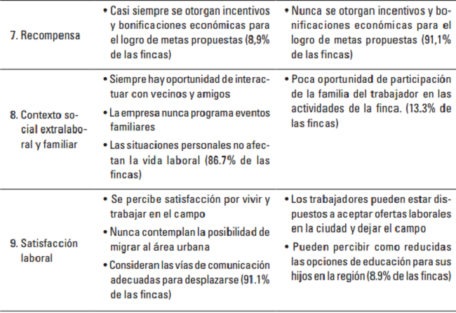 En cuanto a la dimensión 8, “Contexto Social, Extralaboral y Familiar”, en 15 fincas (33,33%), se observó tendencia a valoraciones 1 y 2, lo cual evidenció problemas relacionados con la baja oportunidad de interacción con vecinos y amigos, recreación y esparcimiento, afectación del trabajo por consumo de bebidas alcohólicas en reuniones con amigos, la ausencia de eventos de integración familiar por parte de la empresa y la afectación de las relaciones familiares por causas laborales.