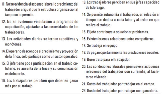 La recolección de la información se hizo a través de encuestas donde se condensaron las variables en relación con el objeto de la investigación. Teniendo en cuenta que en la literatura no se encontró un instrumento específico para medir clima organizacional en las empresas ganaderas, fue indispensable construirlo y validarlo en esta investigación. El diseño del instrumento inició con la definición de términos y con la identificación de las variables de interés, relacionadas con las motivaciones, actitudes, y opiniones de los individuos que forman parte de las unidades productivas, para lo cual, se consultó la literatura y se revisaron herramientas de diagnóstico y evaluación de clima organizacional, al igual que las condiciones laborales específicas para los trabajadores del campo, como son el sistema finca-hogar, donde el trabajador vive con su familia en el lugar de trabajo, lo cual implica que las personas permanezcan en el mismo espacio la mayor parte del tiempo (Castillo et al. 2011; Guerra 2002; Main 2016; Martínez 2005; Ministerio de la Protección Social 2010; Olaz 2013; Patterson et al. 2005; Salazar et al. 2009; Segredo 2013; Escobar y Arias 2015).