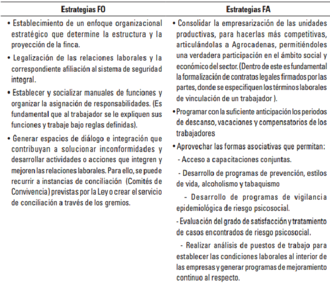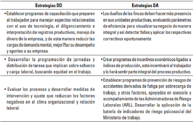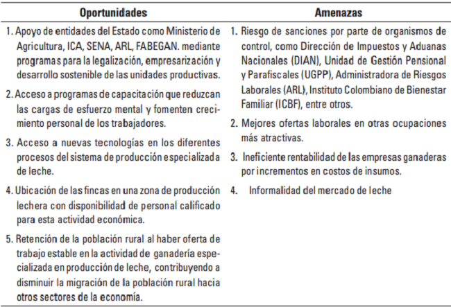 Con base en los resultados obtenidos en esta investigación se realizó el análisis interno y externo del clima organizacional de las empresas ganaderas tecnificadas de ganadería de leche de la provincia del Tundama en el departamento de Boyacá, y se construyó una matriz DOFA (Tabla 5) de acuerdo a la metodología propuesta por Téllez y Cubillos (2002).