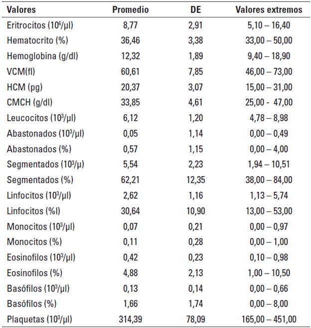 Los valores de hematocrito (Ht) y hemoglobina (Hb) en este estudio fueron similares a los reportados por Wallach y Boever (1983) (Ht 35,0 - 40,0 %), ISIS (2002) (Ht 36,5 - 43,3% y Hb 13,40 ± 160 g/dl) y Rodríguez et al. (2014) (Ht 35,1 - 46,8 % y Hb 12, 7 ± 1,29 g/dl). Las pequeñas variaciones en los valores de hematocrito pueden deberse a diferencias en la dieta, estrés por manejo o estado de hidratación de los animales (Bush 1991).