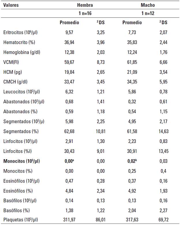 Se determinaron los valores promedio, desviación estándar y valores extremos (mínimo y máximo) de catorce parámetros hematológicos del mono choro común (L. lagotricha) mantenido en cautiverio, mediante la evaluación de 28 individuos de siete zoológicos de la ciudad de Lima (Tabla 1). Según el sexo de los individuos analizados se encontró una diferencia significativa para el valor de monocitos (p < 0,05) (Tabla 2).
