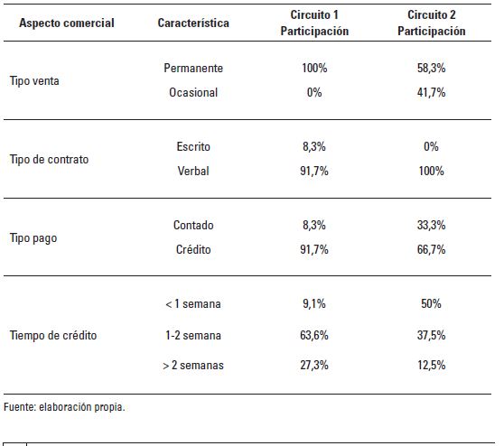 El MADR (2006) reportaron que para el año 2005 en el sistema de mercadeo de cerdos cebados desde las unidades de producción, predominaron las modalidades de venta a los intermediarios o acopiadores (43,1%) y venta a las carnicerías o famas (30,9%), por tanto, los resultados para la subregión presentan un cambio significativo, orientándose hacia la estructuración de canales más cortos de comercialización, generando la coexistencia de dos de estos principalmente: circuito uno, productor-expendedor de carne, circuito dos, productor-intermediario-expendedor de carne. En la Tabla 1 se muestran las condiciones contractuales en cada circuito para el Valle de Aburrá.