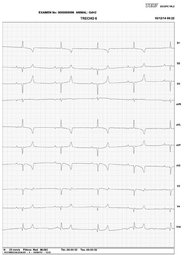 Resultados: 99 animales mostraron ritmo sinusal, entre los cuales se observó bloqueo anterior del fascículo izquierdo en una hembra del G2 y en una del G4; a su vez, una hembra del G3 presentó arritmia sinusal y en una del G2 se evidenciaron tres complejos ventriculares prematuros. La presencia de una onda P única y positiva, complejo QRS tipo QR y onda T bifásica fueron los más observados en todos los grupos. Una disminución significativa del eje cardiaco se observó en el G1 cuando se comparó con los demás grupos; además, el G1 presentó aumento significativo en valores de frecuencia cardiaca, PAS, PAM y PAD.