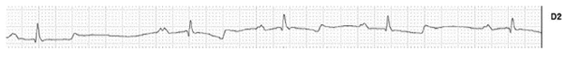 In the heart rate evaluation, the presence of sinus rhythm in 99 animals (99%) was observed; Meanwhile, two animals showed sinus rhythm with intraventricular conduction defect (ICD), showing characteristics in the ECG similar to the left fascicle anterior block (2%), being a female of G2 and another female of G4 (Figure 1). The presence of sinus arrhythmia was observed in 1 animal (1%), being a female of G3 (Figure 2). A female of G2 (1%) presented arrhythmia, characterized by the presence of 3 premature ventricular complexes.