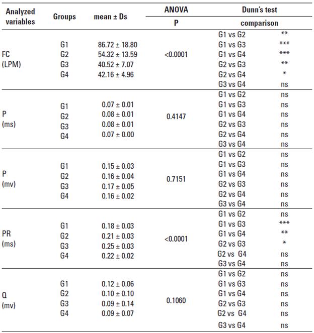 Results: 99 animals showed sinus rhythm, among which one female from G2 and one from G4 exhibited left fascicles anterior block; a female from G3 had sinus arrhythmia and one female from G2 evidenced 3 premature ventricular complexes. The presence of a unique and positive P wave, a QRS complex of the QR type and a biphasic T wave, were the most common in all groups. A significant decrease in the cardiac axis was observed in G1 when compared to the other groups. The G1 group showed a significant increase in heart rate, SAP, MAP and DAP values.