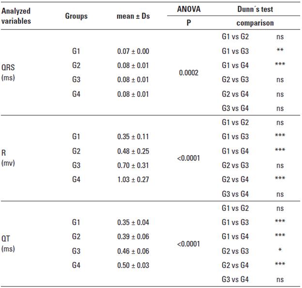 QRS Complex: The QRS complex duration showed statistically difference significantly less for G1 animals respectively compared with the G3, and G4 animals (p < 0.0002) (Table 2). There were no significant differences between G1 and G2, neither between males and females of the same group.