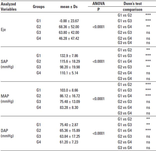 Arterial pressure: SAP values were higher in G1 and G2 groups. G1 showed significant differences compared to the G2 (p < 0.01), G3, and G4 (p < 0.001) groups. The G2 group presented only a significant difference compared with G3 animals (p < 0.01). MAP was higher in animals of the G1 group, showing highly significant differences compared to the other groups (p < 0.001). The G1 group had also higher values for DAP, being highly significant when compared to groups G2, G3 (p < 0.01), and G4 (p < 0.001) (Table 3).