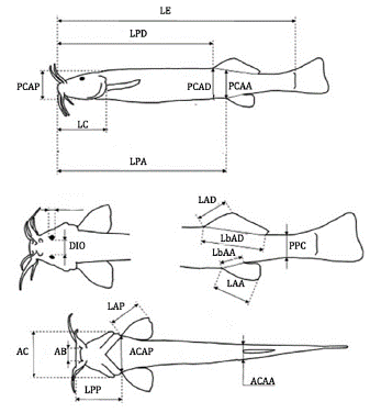 Treinta y tres especímenes (veintisiete hembras y seis machos) procedentes del río Bogotá, específicamente en la región de Suesca (5°06' Norte, 73°48'Oeste, 2584 msnm), conservados en solución de formaldehído (10%), se pesaron de manera individual y se utilizaron para tomar las medidas típicas para los siluriformes, así: longitud total (LT); longitud estándar (LE); longitud de la cabeza (LC); longitud preanal (LPA); profundidad del cuerpo en la aleta pectoral (PCAP); ancho del cuerpo en la aleta pectoral (ACAP); ancho del cuerpo en la aleta anal (ACAA); ancho de la cabeza (AC); distancia interorbital (DIO); ancho de la boca (AB); longitud predorsal (LPD); longitud prepectoral (LPP); longitud de la aleta pectoral (LAP); longitud de la aleta dorsal (LAD); longitud de aleta anal (LAA); longitud de la base de la aleta dorsal (LbAD); longitud de la base de la aleta anal (LbAA); profundidad del pedúnculo caudal (PPC); profundidad corporal en aleta dorsal (PCAD) y profundidad corporal en aleta anal (PCAA). Dichas medidas fueron realizadas utilizando un calibrador Vernier* con precisión de 0.1 mm (Figura 1).