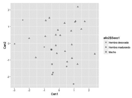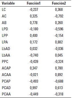 La trasformación alométrica permitió eliminar el efecto del tamaño de los animales para la realización del análisis discriminante canónico. Los coeficientes de correlación de Pearson entre las variables transformadas y la longitud estándar fueron no significativos (p > 0,05). Por su parte, el análisis de varianza multivariado (MANOVA) para las variables transformadas indicó que las tres categorías reproductivas (hembra en maduración, hembras desovadas y machos) no diferían en su vector de medias (Prueba de Lambda Wilks p > 0,9441). De manera similar, las funciones discriminantes canónicas obtenidas no permitieron una diferenciación clara entre las tres categorías reproductivas (Tabla 2; Figura 2). Sin embargo, se observó que las hembras desovadas presentaron valores negativos para la función 1, la cual tiene una alta carga factorial para la profundidad corporal en aleta dorsal (PCAD); es decir, que las hembras desovadas tienen menor profundidad corporal que las que están en maduración.