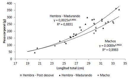 El coeficiente alométrico de la relación LT-Peso (Peso = aLTb) fue numéricamente superior para las hembras en maduración que para los machos. Tanto para las hembras en maduración como para los machos el coeficiente alométrico fue significativo (p < 0,05). Para dos de las tres hembras desovadas evaluadas el peso fue inferior al peso predicho para su LT lo cual se debe fundamentalmente a la pérdida de peso ocasionada por el desove (Figura 3).