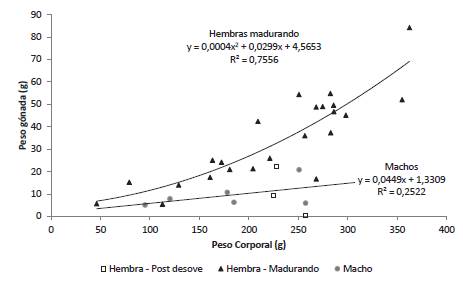 Para las hembras en maduración el incremento del peso del ovario en función del peso corporal se ajustó a un modelo cuadrático (p < 0,05) que sugiere una velocidad del crecimiento relativo del ovario mayor que el resto del cuerpo. El peso del ovario de las hembras desovadas fue inferior al predicho por la ecuación de regresión ajustada para las hembras en maduración lo cual es producto de la disminución del peso de la gónada causada por el desove (Figura 4). Para los machos la relación entre el peso del testículo y el peso corporal fue ajustada a un modelo de regresión lineal simple; sin embargo, debido al limitado tamaño de muestra y a la baja variación en el peso del testículo el coeficiente de determinación fue bajo y la pendiente no significativa (p = 0,31).