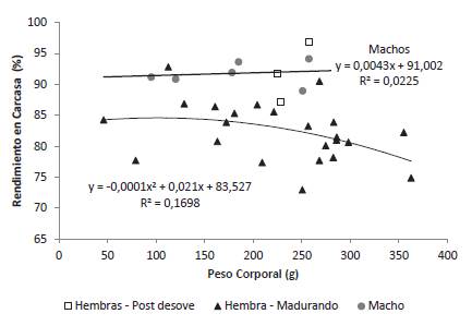 El rendimiento en carcasa de los machos (91,79% ± 1,91) fue superior al de las hembras en maduración, pero similar al de las hembras desovadas (91,89% ± 4,85). Para los machos el peso del animal no afectó el rendimiento de carcasa. Para las hembras en maduración entre 46 y 181 g de peso corporal (n = 8) el rendimiento en carcasa fue de 84,76% ± 4,46 y para las hembras en maduración con pesos entre 204 y 363 g (n = 15) el rendimiento fue de 81,11% ± 4,54. Se observó así una asociación entre el peso corporal y el rendimiento en carcasa que se describió por una ecuación cuadrática que sugiere una disminución del rendimiento de carcasa a partir de los 105 g de peso corporal. Para dicha ecuación el coeficiente de determinación fue bajo y el modelo no significativo (p = 0,15) lo cual se explica por la baja variación del rendimiento en carcasa (coeficiente de variación 6,7 %) en el intervalo de pesos corporales de las hembras en maduración evaluadas y a la dispersión de los datos alrededor de la línea de regresión, lo que sugiere que otros factores no considerados en el modelo afectan dicho rendimiento (Figura 5).