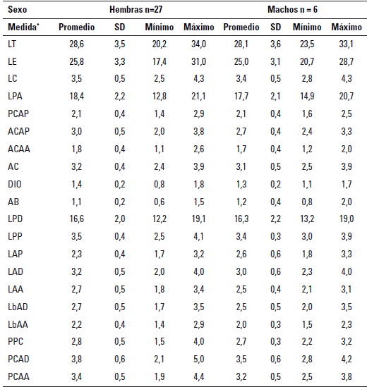 Para todas las medidas morfométricas evaluadas las hembras presentaron medias numéricamente superiores respecto al de los machos. Asimismo, en los ejemplares evaluados se presentó mayor rango de tamaño para las hembras que para los machos (Tabla 1).