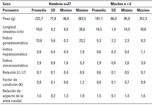 Por su parte, el índice viscerosomático y la longitud relativa del intestino fueron similares entre machos y hembras; sin embargo, el rango fue mayor en hembras que en machos. A su vez, el índice hepatosomático fue numéricamente superior para las hembras que para los machos (Tabla 3). Para las hembras en maduración se encontró una correlación significativa entre el factor de condición y el peso corporal (r = 0,53; p < 0,05), esto se refleja en que para hembras entre 46 y 172 g el promedio de factor de condición fue 0,82 ± 0,13 y para hembras entre 181 y 362 g fue de 0,95 ± 0,15. Para las tres hembras desovadas el promedio de peso fue de 237 g y el del factor de condición 0,90 ± 0,16. La relación de aspecto de la aleta caudal presentó un promedio de 1,57 sin diferencias numéricas entre machos y hembras.
