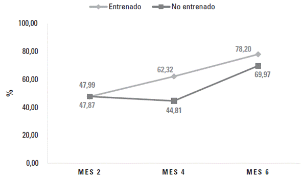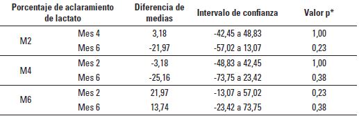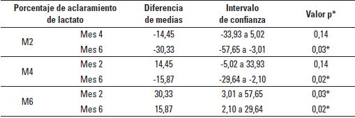 Para establecer las diferencias intra-mediciones del porcentaje de aclaramiento en el grupo entrenado, se aplicó prueba Anova pareada paramétrica, donde se observó mediante prueba de Greenhouse-Geisser que la matriz de varianzas y covarianzas es esférica (p: 0,643). En las comparaciones múltiples se observó que existe un efecto significativo en el mejoramiento del porcentaje de aclaramiento del lactato a medida en el tiempo, así, al comparar la proporción del mes 6 con la del mes 2, se evidenció una diferencia de medias de 30,33 (IC95% 3,01 a 57,65, p: 0,03) al igual que la mejoría en el porcentaje de aclaramiento observada al comparar el mes 6 con el mes 4 (diferencia de medias: 15,87 IC95% 2,10 a 29,64, p: 0,03) (Tabla 3).