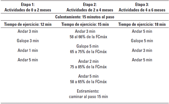 En cada etapa la sesión de ejercicio controlado incluyó: una etapa de calentamiento, en la cual se caminó el caballo en un picadero a su paso, con montura y se mantuvo en la zona de muy baja intensidad y una sesión de ejercicio en la cual se montó al caballo en su andar a baja intensidad, al galope a moderada intensidad, nuevamente en su andar a alta intensidad con aumento de la velocidad y un estiramiento en el cual el caballo caminó con la rienda suelta durante 15 minutos. Las sesiones fueron similares, pero se aumentó el tiempo al galope y en el andar. El esquema de ejercicio puede verse en la Tabla 1.
