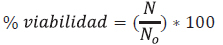 Para la variable viabilidad se tomó 1 g de material microencapsulado el cual fue rehidratado a temperatura ambiente en 9 mi de agua peptonada tamponada al 0,1 % p/v (pH 7,2 ± 2), esto fue homogenizado en vortex y se dejó reposar durante 30 min; después, se tomó 150ul de la dilución y se sembró sobre agar MRS con azules de anilina (380 µl azul de anilina/100 mi agua destilada) y se llevó a incubación en condiciones aerobias a 37°C por un periodo de 48 h. Finalmente, los recuentos se realizaron por duplicado en UFC/g en base seca (Rodríguez et al. 2016a). Los valores encontrados fueron utilizados en la siguiente fórmula para determinar el porcentaje de viabilidad: