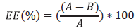 Para la variable eficiencia se usó la metodología descrita por Gonzales et al. (2015). Se tomaron 2 g de material microencapsulado y se diluyeron en 18 mi de agua destilada, luego la mezcla se centrifugó a 5000 rpm por 15 min y se tomó el sobrenadante para los análisis. En este último se determinó la concentración bacteriana y se calculó la eficiencia mediante la siguiente fórmula: