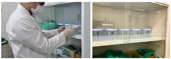 El estudio experimental se realizó en la Facultad de Ciencias Veterinarias de la Universidad Nacional de Asunción (Paraguay). Se utilizó nailon comercial (polimaida) 0,40 mm trasparente adquirido en ferretería, sometido a gas de formalina en comprimidos. Una vez adquirido el nailon se llevó al ambiente de quirófano y se expuso al mismo por 72 horas. Posteriormente, el material se cultivó en el laboratorio para verificar la contaminación del mismo. El material contaminado se seccionó en 5 trozos de 1 g cada uno, que posteriormente se colocaron en 5 recipientes de 1 1 desinfectados con alcohol al 96%, herméticamente cerrados, que contenían 1 g de formalina cada uno. Los recipientes se acondicionaron en el mueble del servicio de cirugía dentro de la sala de esterilización, a una altura no menor a 1 m (Figura 1). Se midió la temperatura y la humedad relativa ambiental dos veces al día (9 y 13 hs) por medio de un termómetro e higrómetro analógico. Los recipientes se retiraron del mueble una vez por día durante los 5 días del estudio, se trasladaron cerrados directamente del quirófano al aboratorio del Departamento de Microbiología e Inmunología donde se abrieron bajo condiciones asépticas según procedimiento del laboratorio y se evaluaron a través del recuento de mesófilos por gramo.