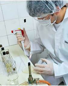Las muestras se procesaron por la técnica de recuento en placa para mesófilos para así obtener la cantidad de bacterias en unidades formadoras de colonias. Se introdujo el hilo en bolsas de Stomacher' al que se le agregó 9 ml de agua peptonada. A partir de este punto se realizaron las diluciones sucesivas extrayendo 1 ml del tubo y colocando en otro con 9 ml de agua peptonada, lo cual se realizó hasta obtener la dilución a la -6. Una vez realizadas las diluciones se procedió al cultivo de las mismas por duplicado en agar de recuento en placa, colocando 100 ul en cada placa y esparciendo con la espátula de Drigalsky® (cultivo en superficie) (Figura 2). Todas las placas se llevaron a la estufa a 37°C. Luego de 48 horas de incubación se procedió al conteo, para lo cual, se contabilizaron aquellas placas que contenían de 30 a 300 colonias y se multiplicaron por la inversa del factor de dilución.