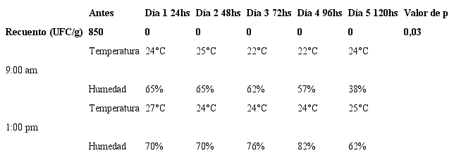 Para determinar el efecto esterilizante del gas de formalina se hicieron evaluaciones antes y después de la exposición a los gases de formalina en comprimidos, a las 24, 48, 72, 96 y 120 horas y se midieron y expresaron en Unidad Formadora de Colonias por gramo (UFC/g). Los resultados de la prueba de laboratorio se interpretaron de manera cualitativa, en estéril o no estéril. Las colonias se identificaron por medio de su morfología teniendo en cuenta sus características: pequeñas colonias blanquecinas, redondas de superficie lisa y bordes definidos.