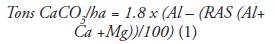 Where 1.8 is a constant, RAS it is the maximum percentage of aluminum that tolerates Brachiaria grasses 35%, Al is aluminum concentration (3.1 cmol kg-1), was determined by using potassium chloride 1 N extraction and quantification by volumetric colorimetric, Ca+Mg are soil bases ( 2.2 and 1.3 cmol kg-1), that were determined by ammonium acetate extraction 1 N (pH 7), following the standardized methods and procedures and recommended by the Instituto Geográfico Agustín Codazzi (2016). Description of soil properties in initial soil analysis showed extremely acid pH (4.5), measured with a potentiometer method, for which a water:soil solution (1:1) was prepared (IGAC 2016).