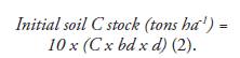 Where C is the amount of carbon in tons ha-1, bd is the bulk density in tons m3-1, and d is the sampling at 30 cm depth. Values of bulk density in the field was uniform and ranged of 1.2 to 1.24 tons m3-1 between the experimental units.