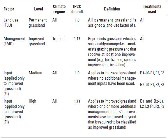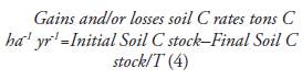 Which T is time dependence on a projection of twenty years old for default values that represents soil C stocks changes by the influence of soil management factors in grasslands at 0.30 m depth (IPCC 2006). In addition to the intensity of management adopted (for instance, high, medium and low inputs) those factors take into account also climate and soil type in the specific region (tropical zone). The rates served to project soil CO2-eq emissions and/or sinks to the atmosphere. A conversion factor of C to CO2 of 3.67 was used (IPCC 2006).