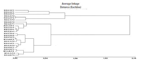 0ur results in dendogram of Figure 1- systemically illustrated the efect of pasture type, lime doses and N, P, K fertilizers sources on predicting soil C02-eq sinks-The cluster analysis showed that two large groups were formed- Cluster 1 form the major sinks of soil C02-eq- B2 and higher lime doses were distinctly separated from B1 and non-lime and medium lime doses that form cluster 2, in both the fertilization with F1, F2 and/or F3 did not show the obvious patterns under diferent lime doses levels possibly du to that lime treatments increased the utilization of the fertilizers on soil C02-eq sinks.