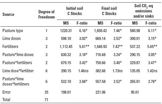 Table 2 shows that pasture type, lime doses, pasture*lime doses, pasture*fertilizers and triple interaction have significant impacts on the soil initial C stocks, soil final C stocks, and soil CO2-eq emissions, when the significant level is 0.05 (p < 0.05). While the interaction lime doses*fertilizer is not significant, when the significant level is 0.01 and 0.05. However, fertilizer is highly significant, when the significant level is 0.01 (p < 0.01).
