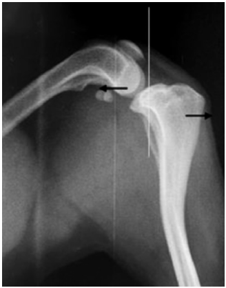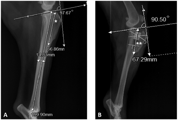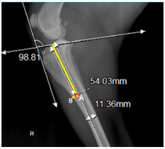 Para lo anterior se necesita conocer el valor del ángulo de desplazamiento de tuberosidad tibial, que se forma de 2 líneas perpendiculares que se interceptan entre sí; la primera, formada por 2 puntos ubicados craneal a la rótula y craneal a la tuberosidad tibial; la segunda, orientada sobre la meseta tibial por una línea que pasa por los puntos de inserción de ambos ligamentos cruzados dejando la eminencia intercondílea como punto central.