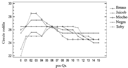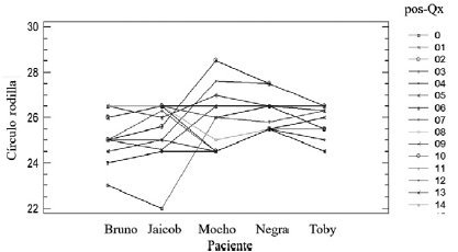 El otro gráfico que se analizó es el de la interacción entre la circunferencia de la rodilla, en cada uno de los 5 pacientes que se muestra a continuación (figura 10). Este gráfico expresa lo siguiente: En general, el comportamiento de la circunferencia de la rodilla fue similar en los 5 animales. El 80% de los pacientes no presentaron secreciones purulentas ni dehiscencia de la herida con cicatrización cutánea completa para el día 15. Solo un paciente (20%) presentó una respuesta inflamatoria mayor debida a una reacción de cuerpo extraño en respuesta al hilo de sutura absorbible que se hizo visible (polyglactin 910), con cicatrización al día 20 posterior a la retirada de la sutura.
