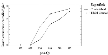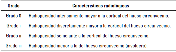 Se realizó proyección mediolateral de la rodilla, después de la cirugía y a los 30, 60, 90 y 120 días. Las radiografías se analizaron en cuanto a su radiopacidad para clasificarlas en grados, de acuerdo con la comparación entre el hueso implantado y el hueso circunvecino (tuberosidad tibial y tibia caudal) (tabla 3).