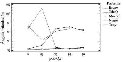 Durante los primeros 8 días posquirúrgicos, se presentó incremento brusco del ángulo en 1 de los pacientes, atribuido al desplazamiento de la cuña por sobres-fuerzo y superada a partir del día 30, se aprecia que el ángulo se aproximó a 90°. Quedaron con ángulo articular mayor a 90° al momento de la implantación 2 de los 5 pacientes y, a medida que fue avanzando la cicatrización ósea, el ángulo se aproximó a los 90°. Lo anterior se reflejó en el comportamiento que tuvo la variable claudicación atribuida a la neutralización del movimiento de cizallamiento ejercido sobre la articulación y disminución de la tensión sobre los ligamentos cruzados, lo que coincide con los resultados de Verez et al. (2016).